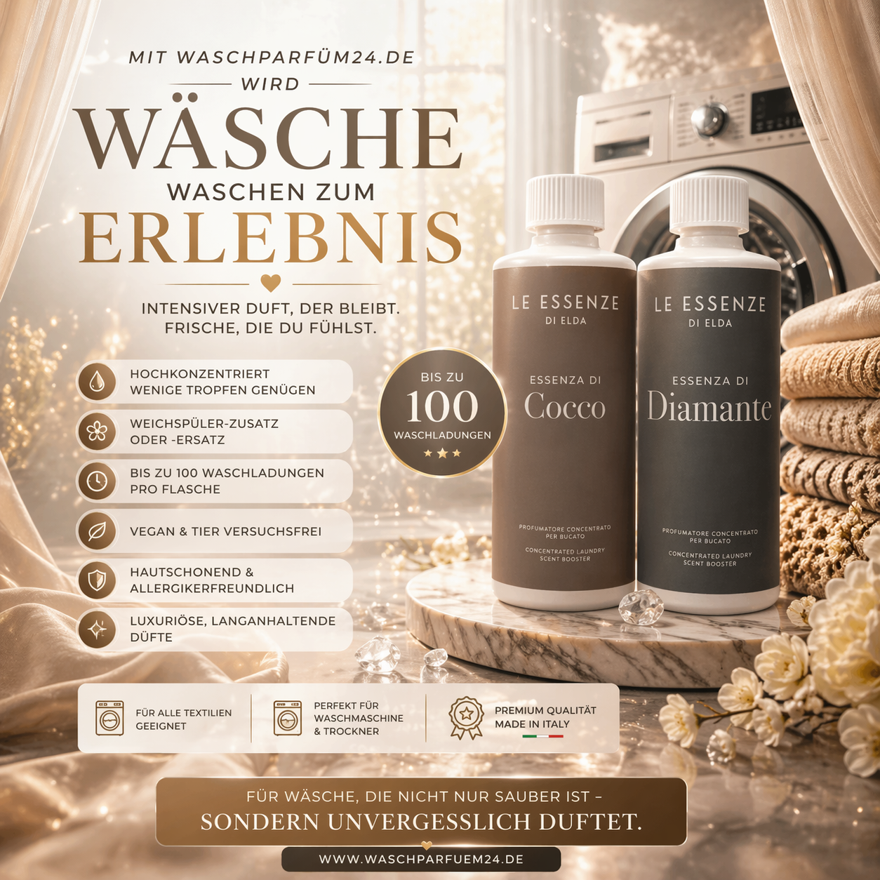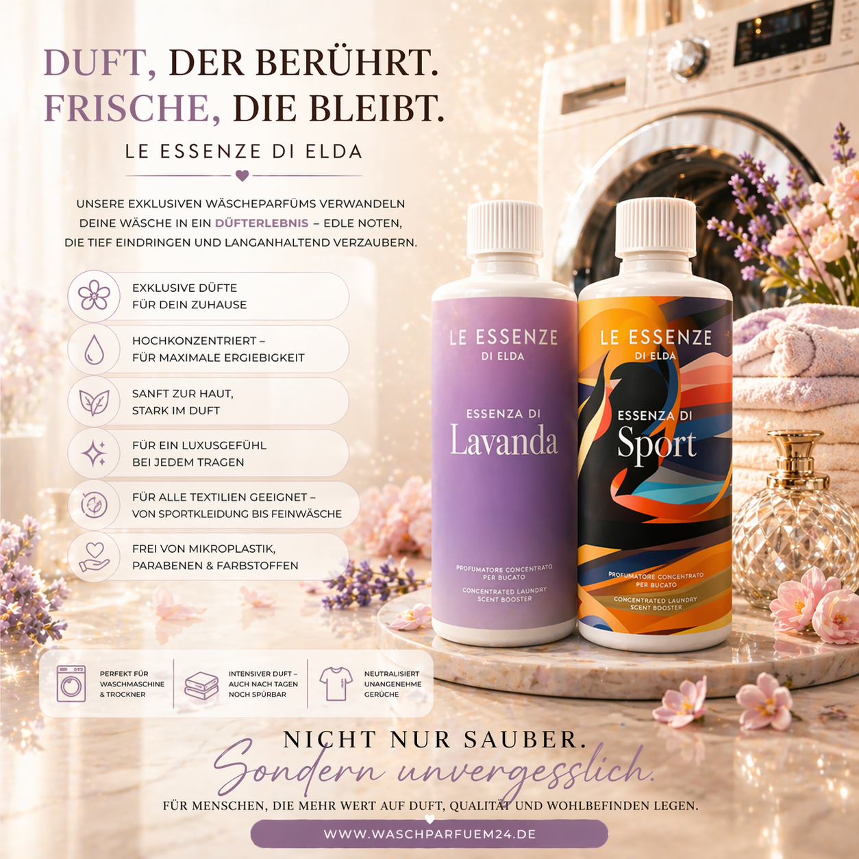 Weil saubere Wäsche heute nicht mehr reicht. Unsere Wäscheparfüms und Waschdüfte von Le Essenze di Elda verwandeln jeden Waschgang in ein echtes Dufterlebnis – intensiver, hochwertiger und deutlich langanhaltender als herkömmliche Waschperlen oder Duftzusätze.